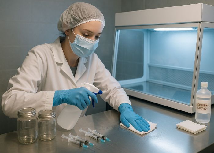 - Руки и перчатки нужно обрабатывать не реже, чем инструменты. Каждое прикосновение, каждый вдох в сторону открытой банки — потенциальный путь заражения. Маска и шапочка — не паранойя, а базовая защита от собственных волос, дыхания и микрофлоры.